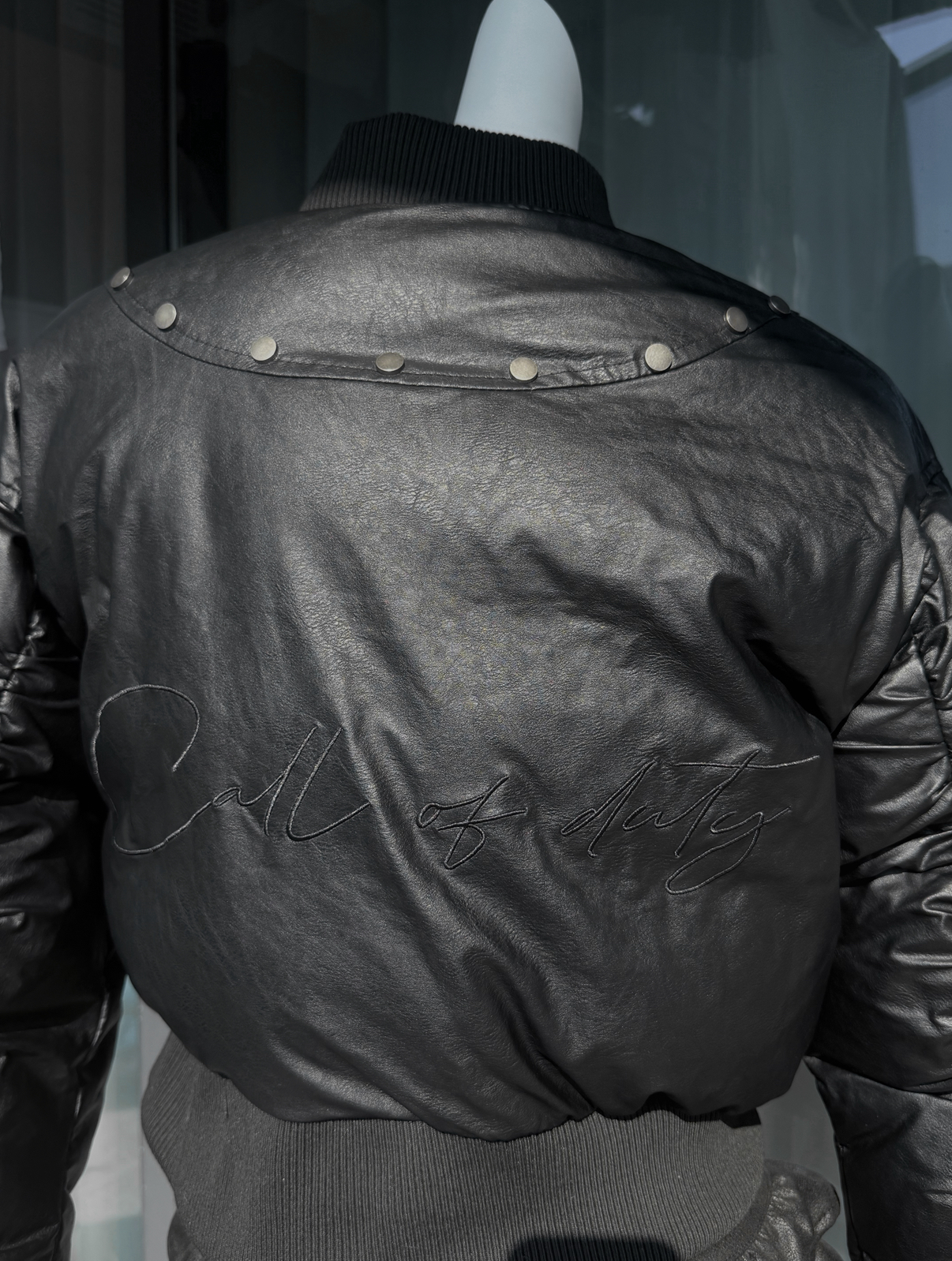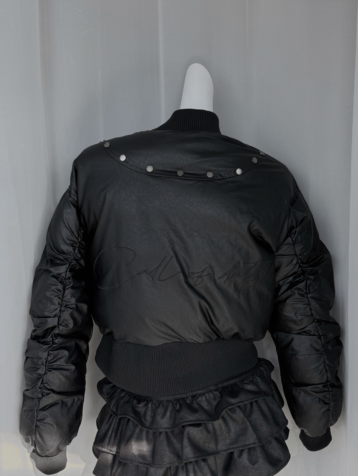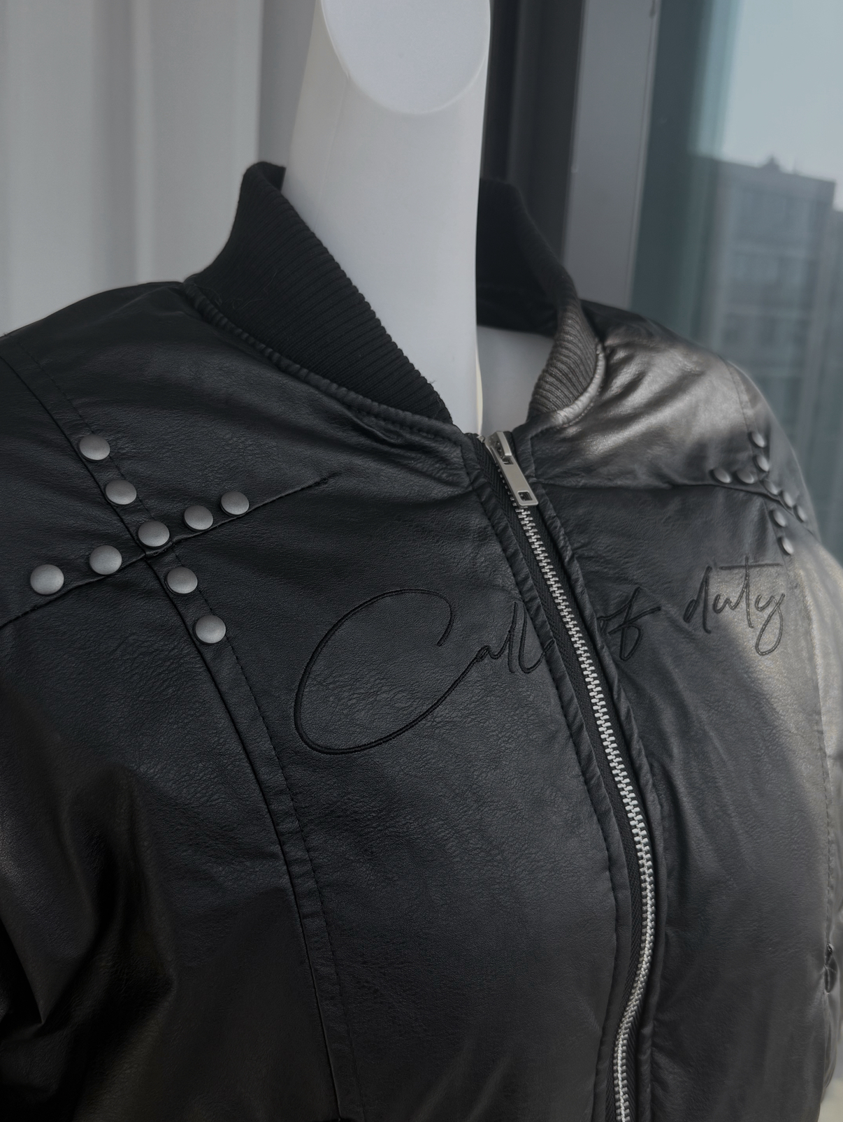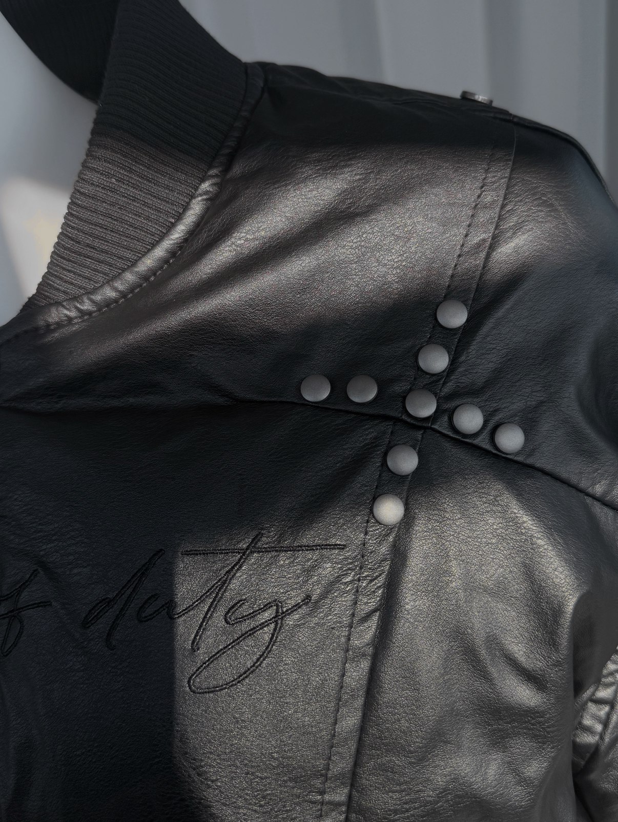 肩線與胸前的金屬鉚釘細節