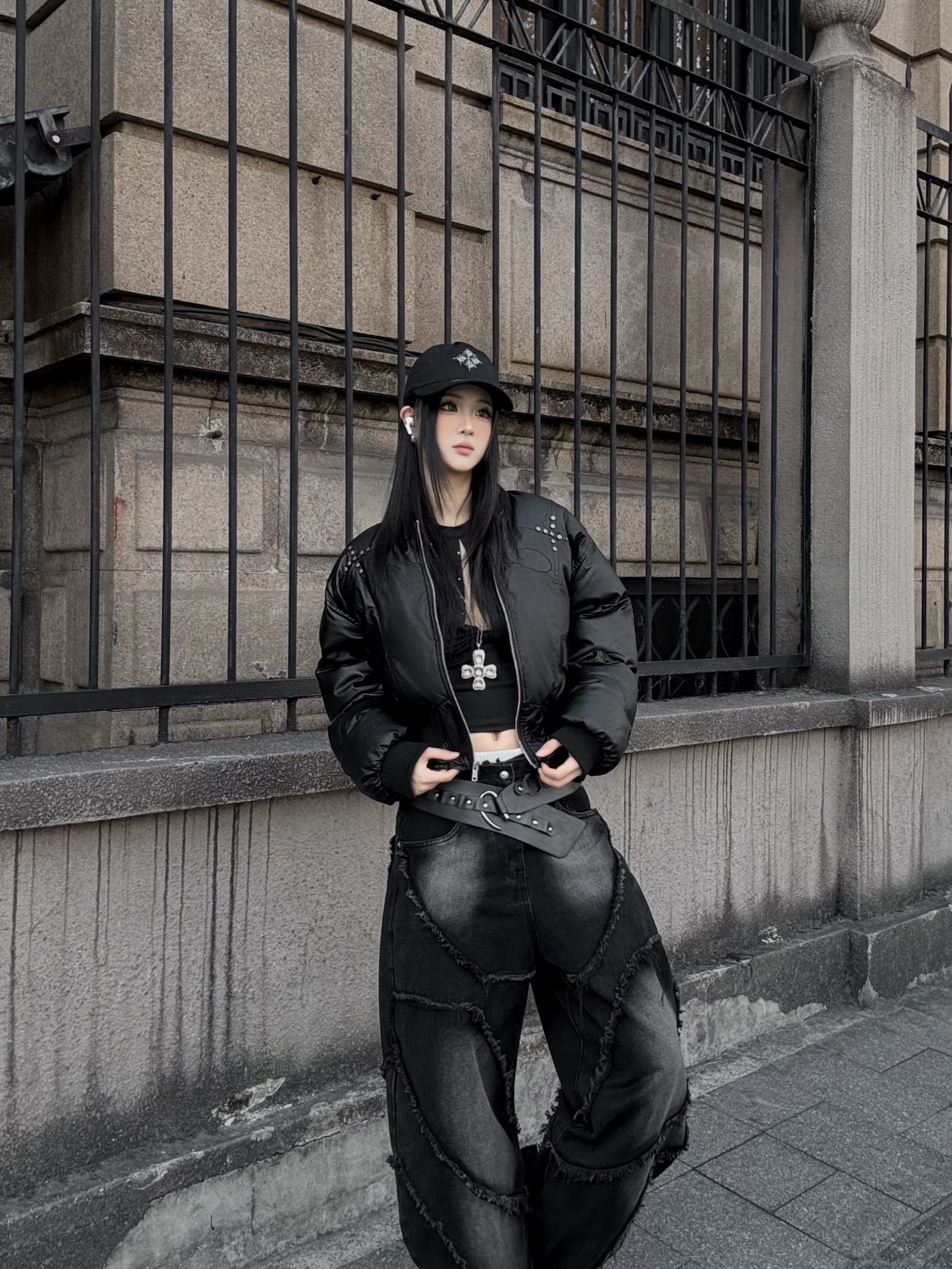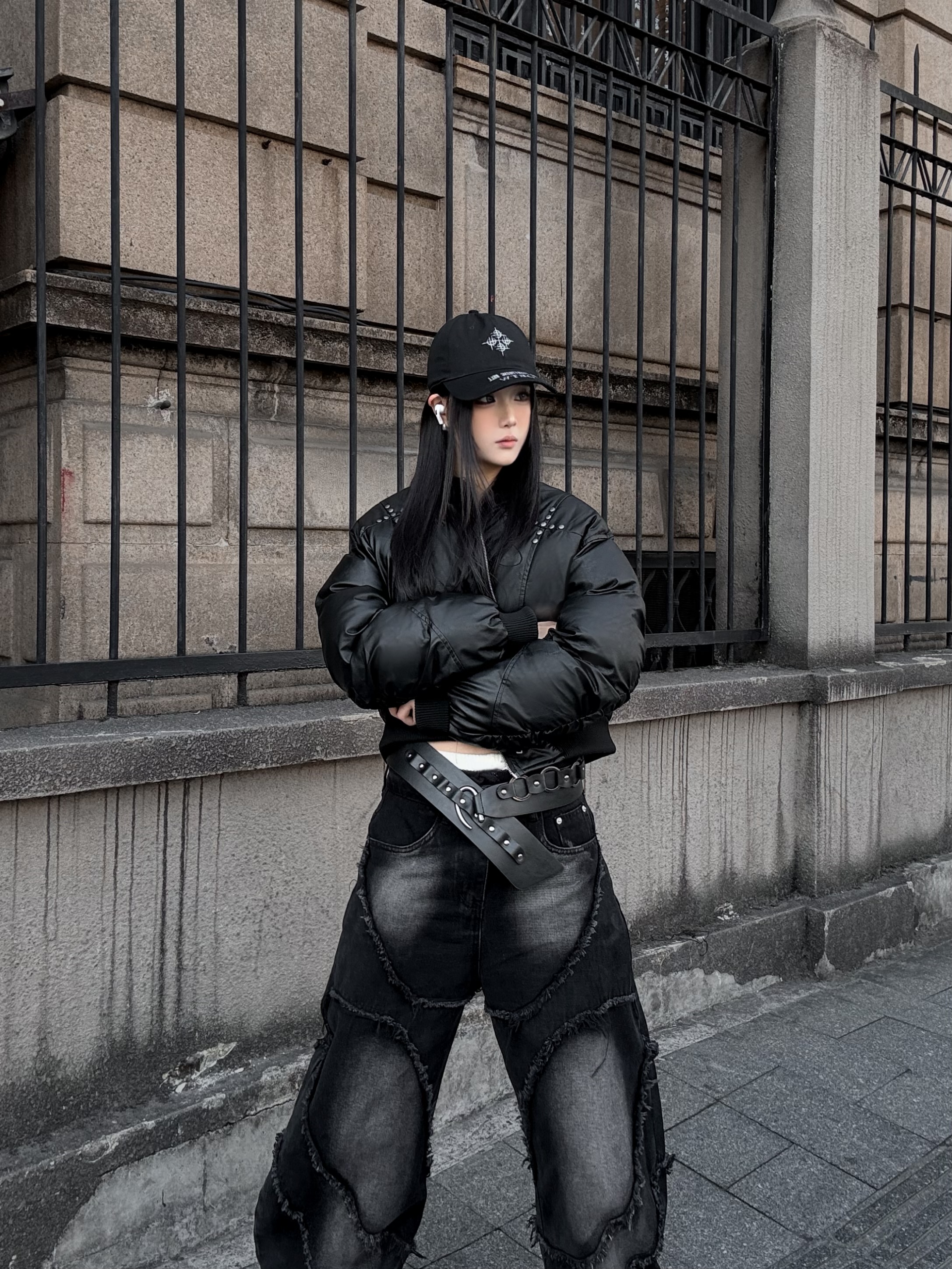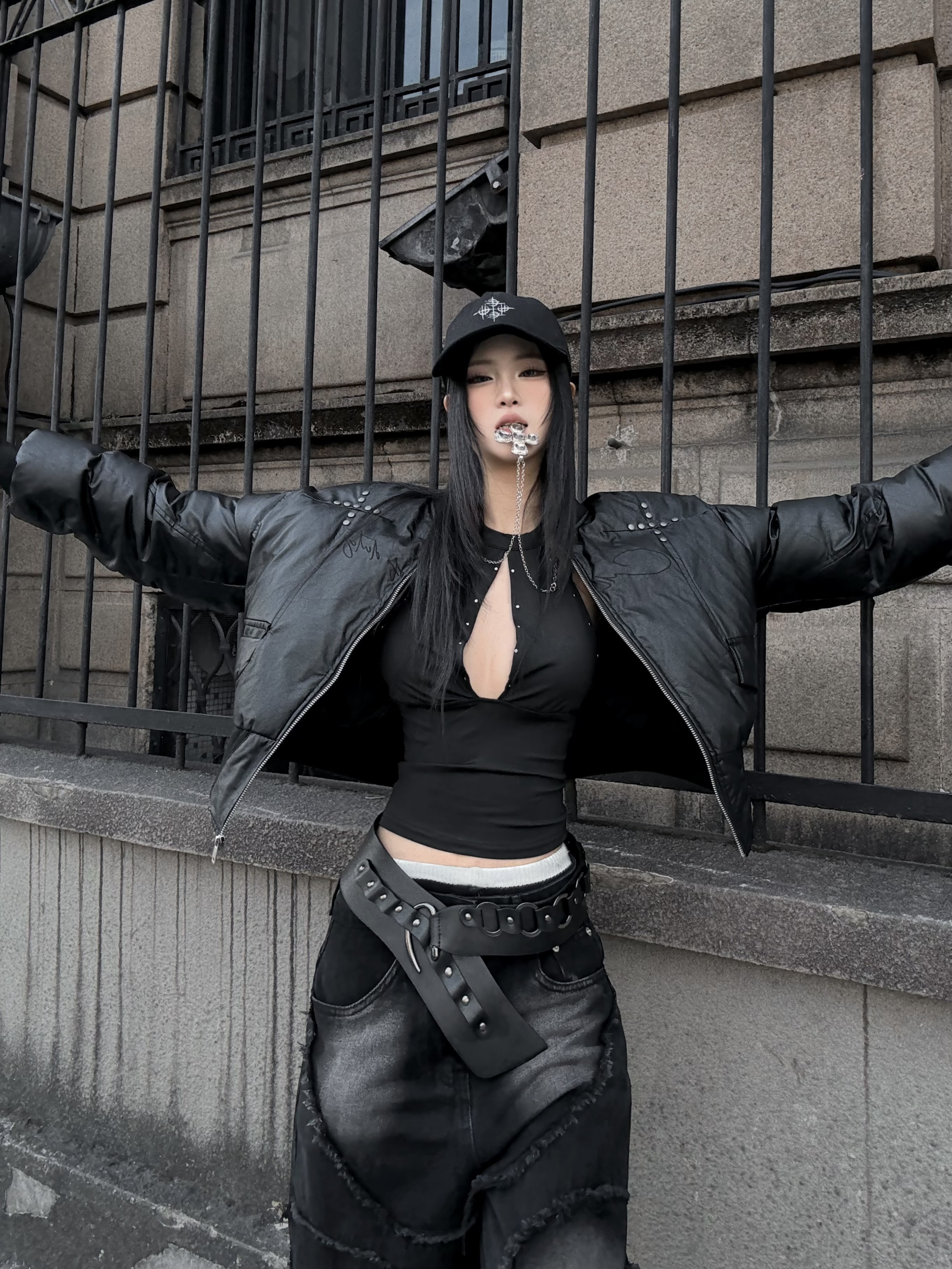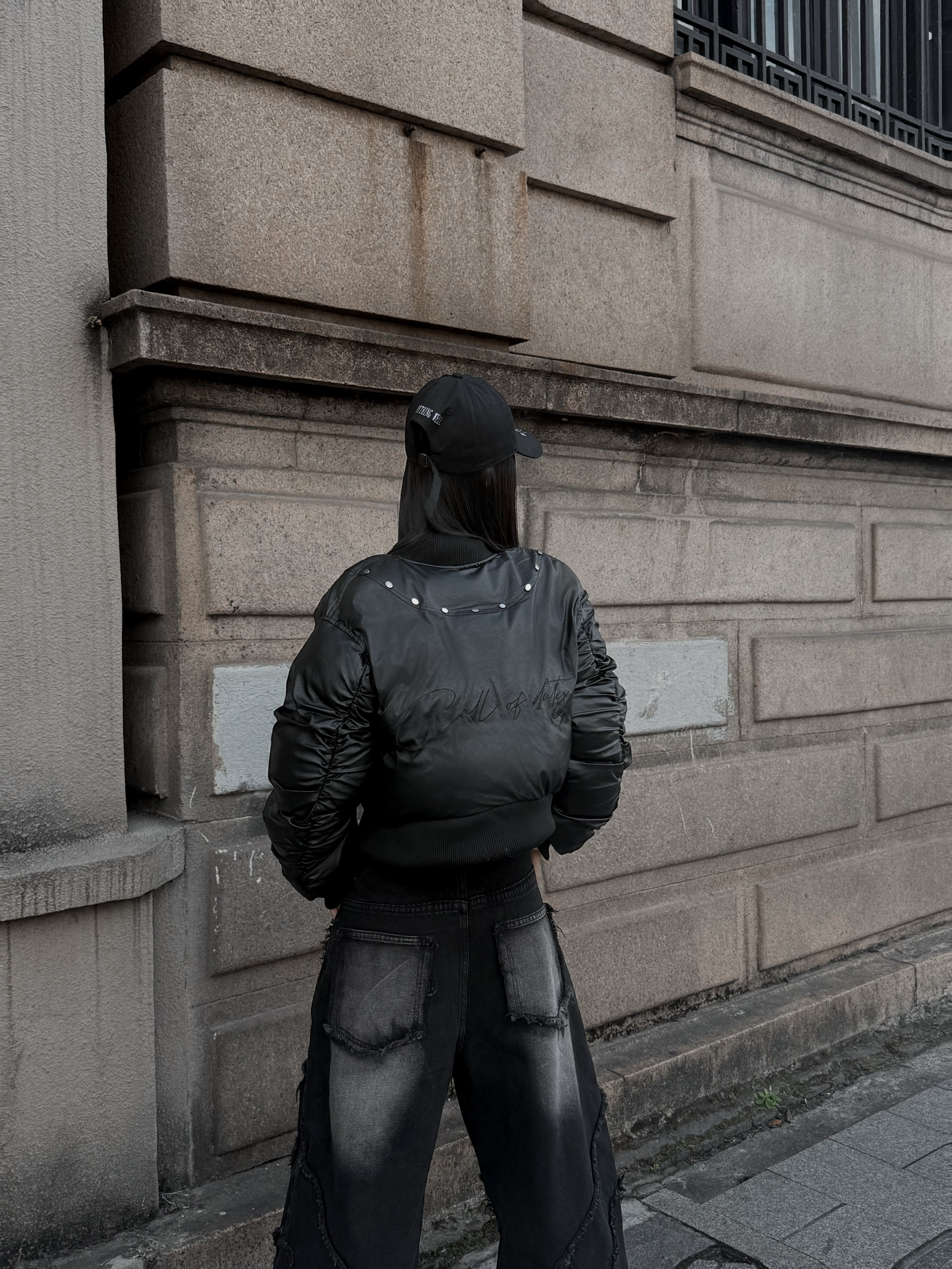 肩線與胸前的金屬鉚釘細節